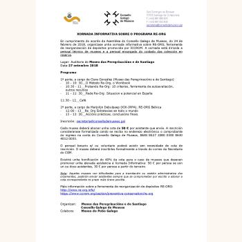 El Consello Galego de Museos y el Museo das Peregrinacións e de Santiago organizan una jornada informativa sobre RE- ORG, herramienta de reorganización de depósitos promovida por ICCROM. La jornada está dirigida a personal técnico de museos y a personal encargado del cuidado de las colecciones en reserva.