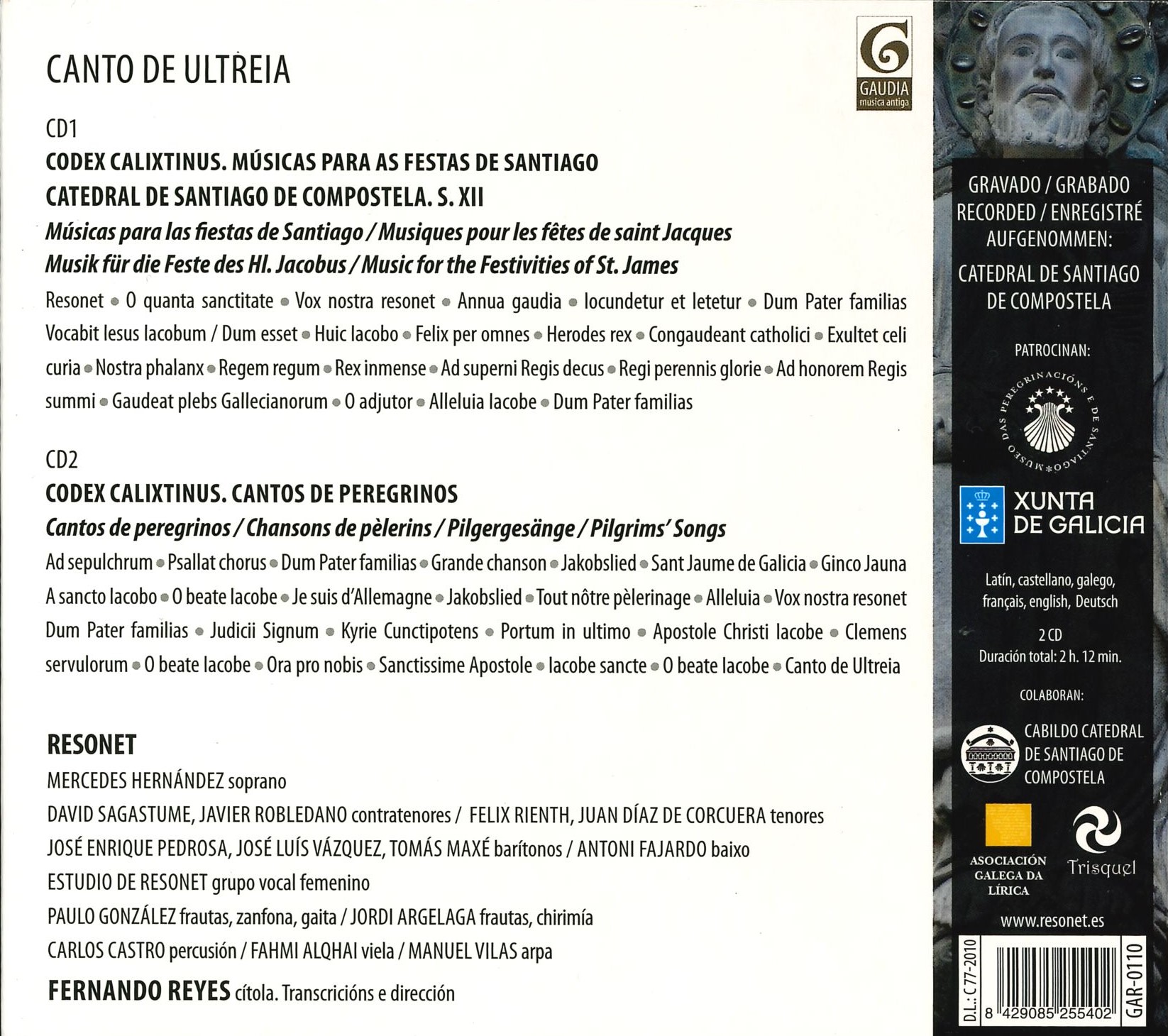 Cuanto de Ultreia. Músicas de Santiago de Compostela. S. XII. Codex Calixtinus, cuantos de peregrinos. RESONET. Fernando Reyes. Dirección. 2010.